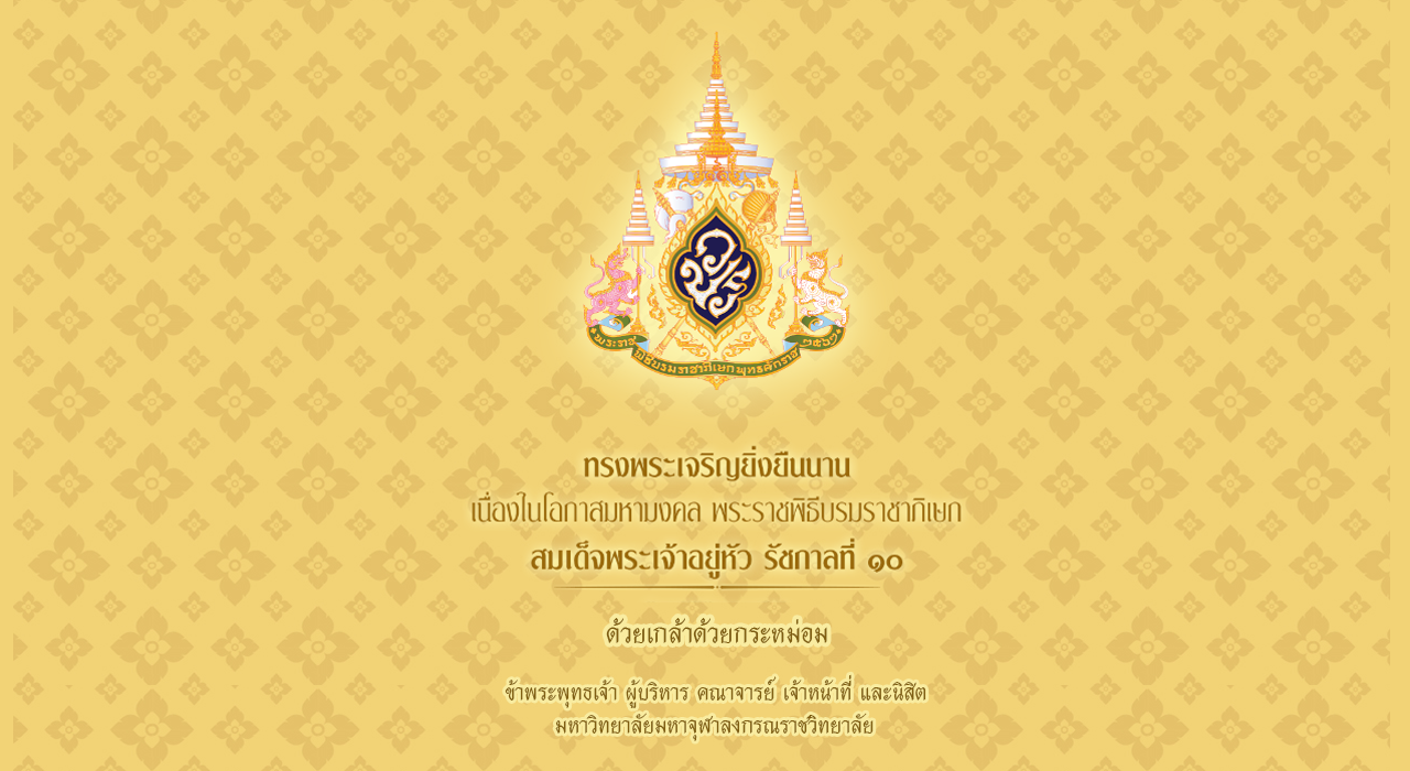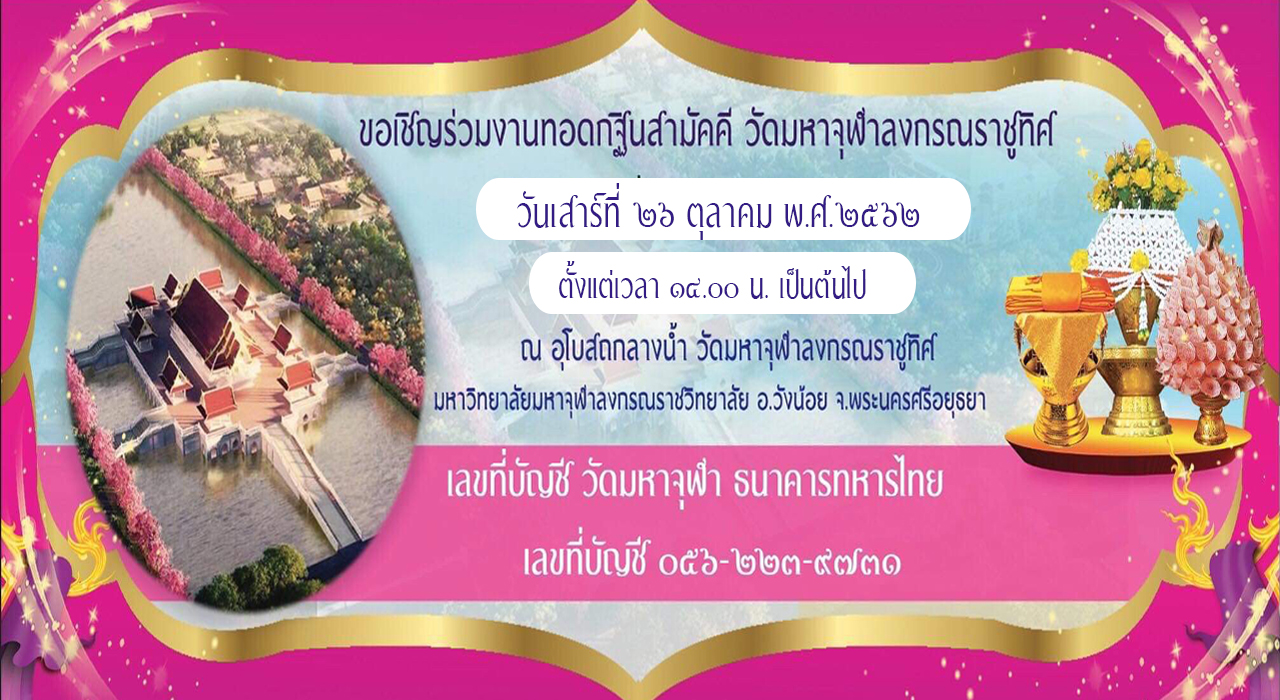 ขอเชิญร่วมงานทอดกฐินสามัคคี วัดมหาจุฬาลงกรณราชูทิศ : ขอเชิญร่วมงานทอดกฐินสามัคคี วัดมหาจุฬาลงกรณราชูทิศ ในวันที่ ๒๖ ตุลาคม ๒๕๖๒ ตั้งแต่เวลา ๑๔.๐๐ น. ณ อุโบสถกลางน้ำ วัดมหาจุฬาลงกรณราชูทิศ มหาวิทยาลัยมหาจุฬาลงกรณราชวิทยาลัย วังน้อย อยุธยา